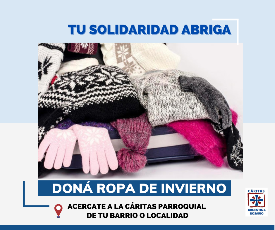“TU SOLIDARIDAD ABRIGA”En estos días de tanto frío aumenta la demanda de ropa de abrigo en nuestras Cáritas Parroquiales.Te invitamos a colaborar para que niños, jóvenes y adultos puedan estar abrigados.¿Que podés donar?– Frazadas- Camperas- Buzos- Medias – Pullovers – Pantalones – Gorros – Guantes – Bufandas – Calzado ACERCA TU DONACIÓN A LA CÁRITAS PARROQUIAL DE TU BARRIO O LOCALIDAD.Cáritas Rosario, Balcarce 1077, lunes a viernes de 8.30 a 12.00hs